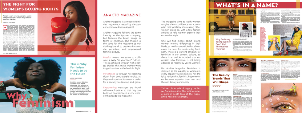 Anakto magazine features feminist articles to produce a culture of thinkers aware of influential female, or gender non-conforming leaders. The target audience is feminists in their 20's to 30's, so the look of the article will be playful and colorful to draw in a younger crowd while maintaining a classy feel.